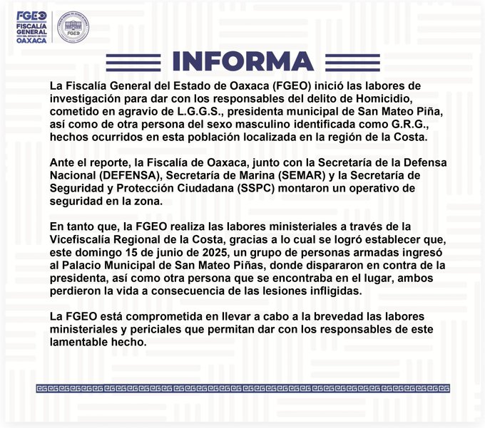“Condenamos enérgicamente el asesinato de la presidenta municipal de San Mateo Piñas, Lilia Gema García Soto. No puede haber impunidad ante este acontecimiento. Vamos a colaborar con la Fiscalía General del Estado para esclarecer los hechos y hacer justicia. Mis condolencias a sus familiares”.