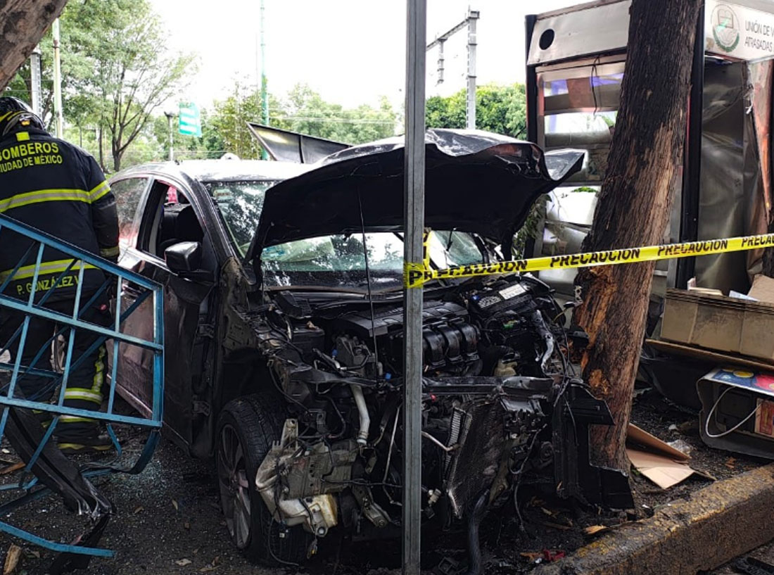 CIUDAD DE MÉXICO, Méx.- Un automóvil se impactó contra la parada de autobús y un puesto de periódicos en la colonia Bosques de Tetlameya, en la alcaldía Coyoacán, CDMX.