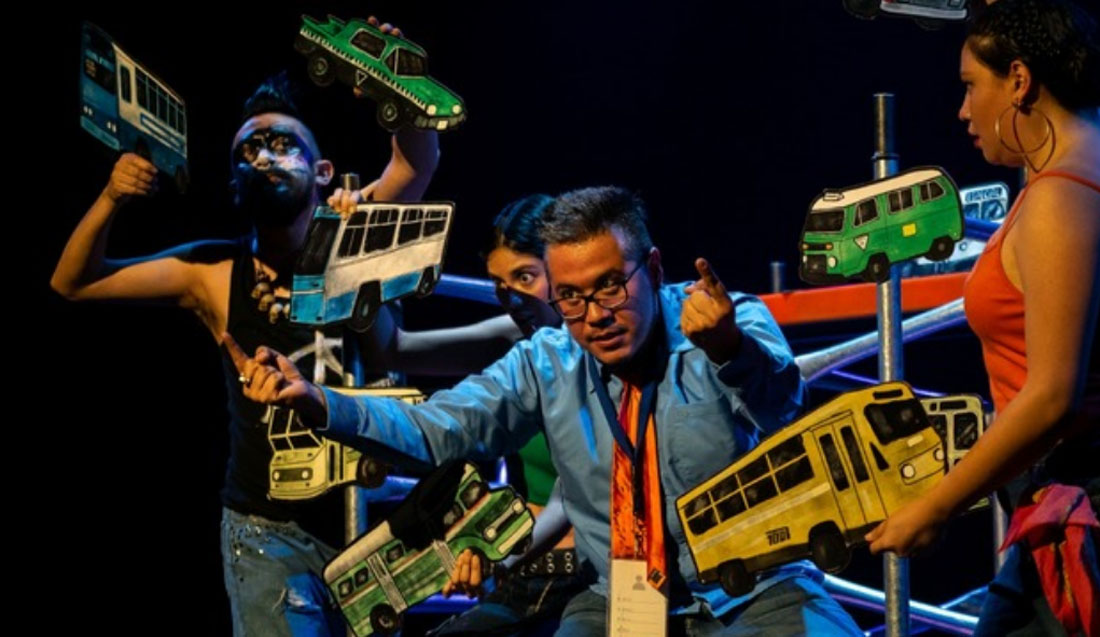 Un escenario que comienza vacío, se transforma y alberga cuatro andamios que, en una coreografía, construyen vecindades, mercados y estaciones de transporte público, que reflejan el dinamismo caótico que define a la capital. En cada escena, más de 300 objetos y títeres cobran vida para dar voz a las historias cotidianas de quienes habitan y transitan la urbe: desde el trabajador “godín” que cruza largas distancias, hasta el bullicio incesante del transporte colectivo.