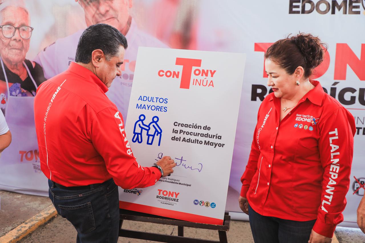 TLALNEPANTLA, Méx.- Ante decenas de personas de la tercera edad, el candidato de la coalición PRI, PAN, PRD y Nueva Alianza, Tony Rodríguez, firmó un compromiso más de campaña y se comprometió a poner en operación la Procuraduría del Adulto Mayor para proteger a los abuelitos de posibles abusos.