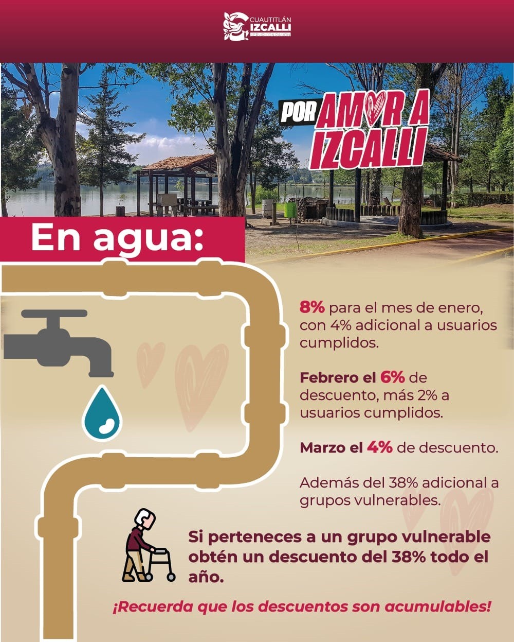 En cuanto a los servicios de agua potable, alcantarillado y saneamiento, en febrero las personas usuarias reciben un beneficio del 6% al pago anual anticipado, más 2% al haber cumplido el pago de estos derechos en los últimos dos ejercicios fiscales. A su vez, las personas vulnerables pueden recibir un subsidio del 38%.