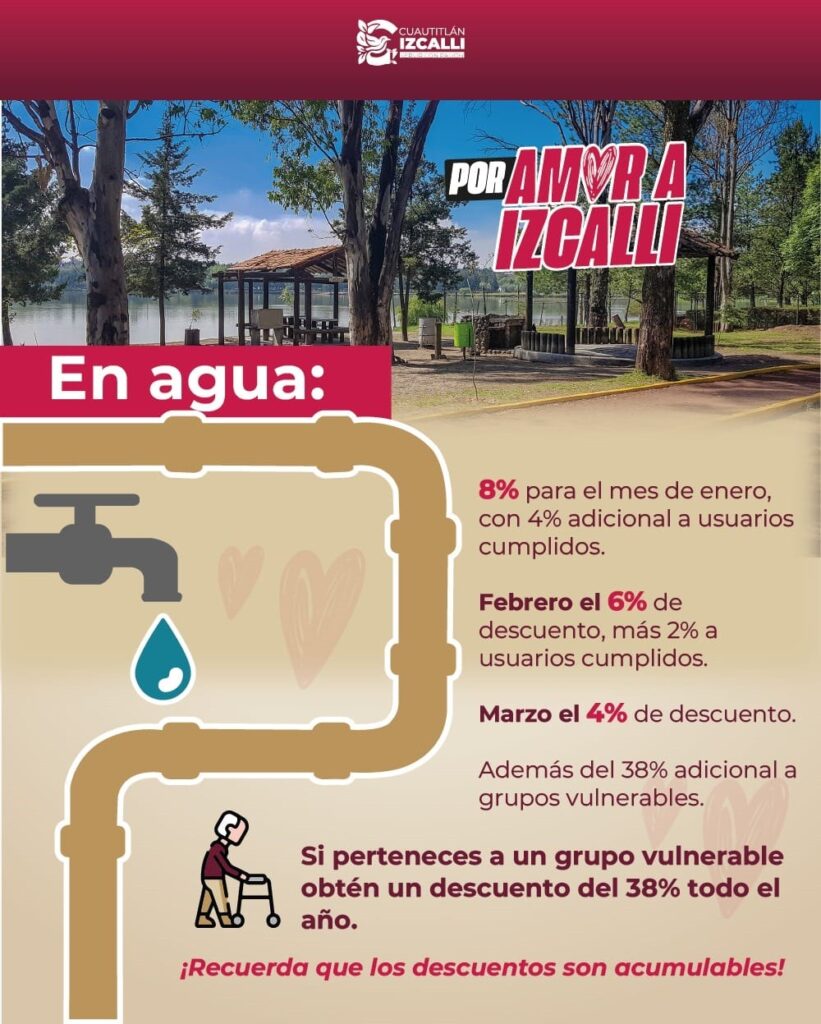 Conforme a lo aprobado por el H. Ayuntamiento de Cuautitlán Izcalli en la primera sesión de Cabildo, para el impuesto predial durante el mes de febrero se aplica el descuento de 6% al pago anual anticipado y 6% adicional para contribuyentes cumplidos; además, personas en condición vulnerable pueden acceder al 34%.