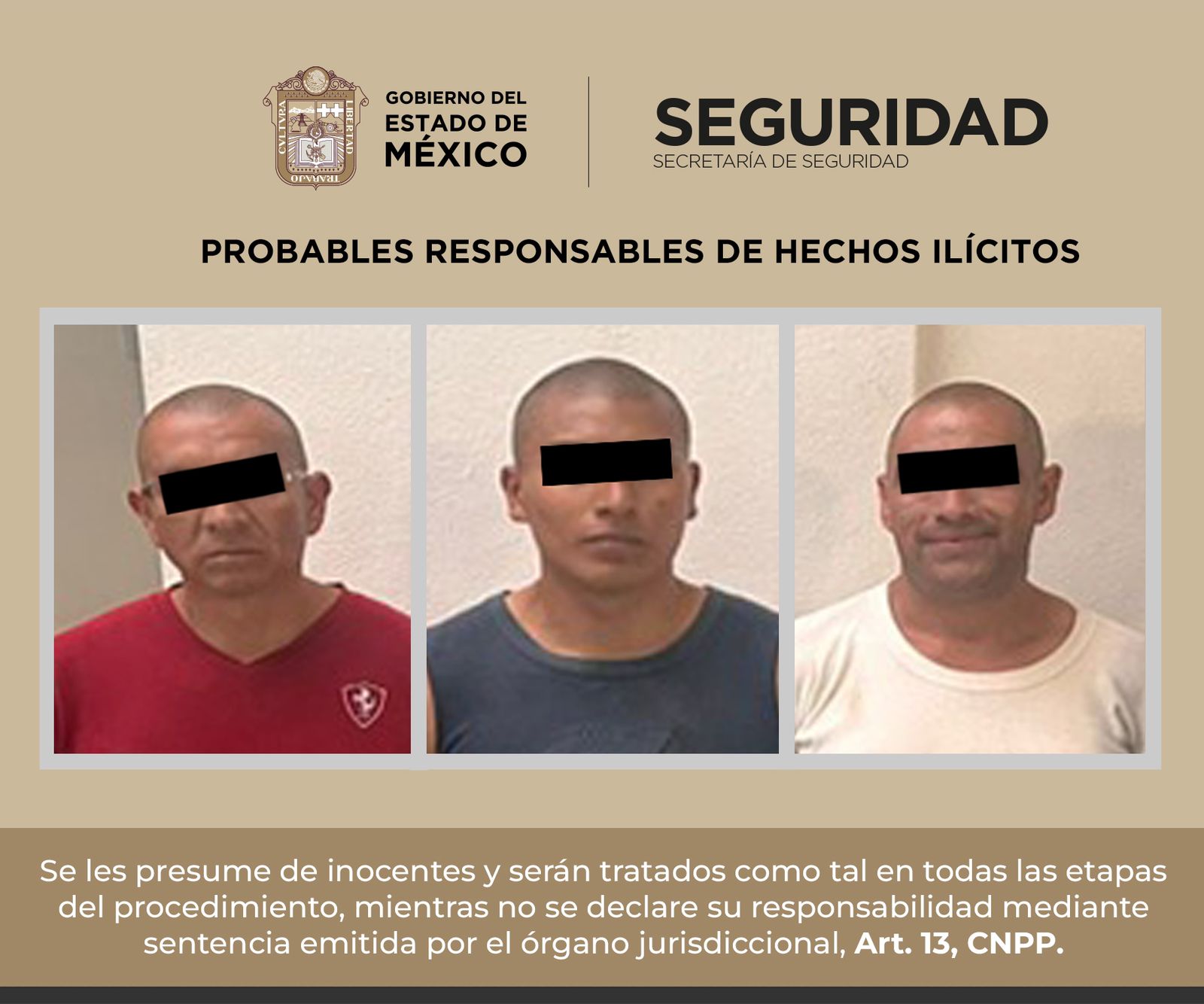 ECATEPEC, Mèx.– En atención a una solicitud de auxilio en campo, efectivos de la Secretaría de Seguridad del Estado de México (SSEM), detuvieron en flagrancia a tres hombres probables responsables del delito de privación ilegal de la libertad en agravio de una mujer; durante la intervención aseguraron un radio de onda corta, un teléfono celular y un par de candados de mano con los que sometían a la víctima.