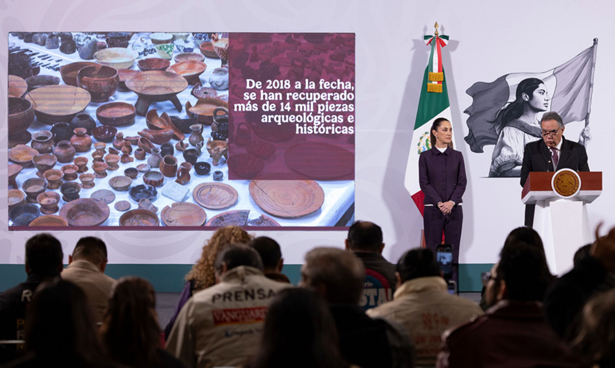 CIUDAD DE MÉXICO, Méx.- Resultado de la voluntad y cooperación que el Gobierno de México ha establecido con diversas naciones, a fin de combatir el que representa el tercer mercado ilícito más lucrativo a nivel global, han retornado al país más de 14,000 bienes del patrimonio cultural, informó en la conferencia matutina la Presidenta de México, Claudia Sheinbaum Pardo.