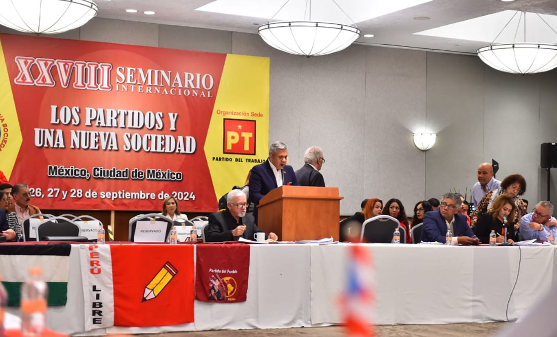 Durante el evento organizado por la dirigencia nacional del Partido del Trabajo al que acudieron líderes de izquierda de todo el mundo, Vilchis Contreras presentó la ponencia “La violencia de la derecha, el crimen organizado y el estado”.
