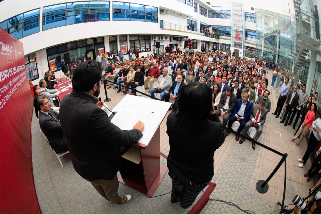 En el patio central del Palacio Municipal, el alcalde enfatizó que este convenio no solamente es un documento administrativo, sino que representa un pacto con respeto a los derechos humanos laborales, a la dignidad de las y los trabajadores y al diálogo, como vía principal para la solución de los conflictos.