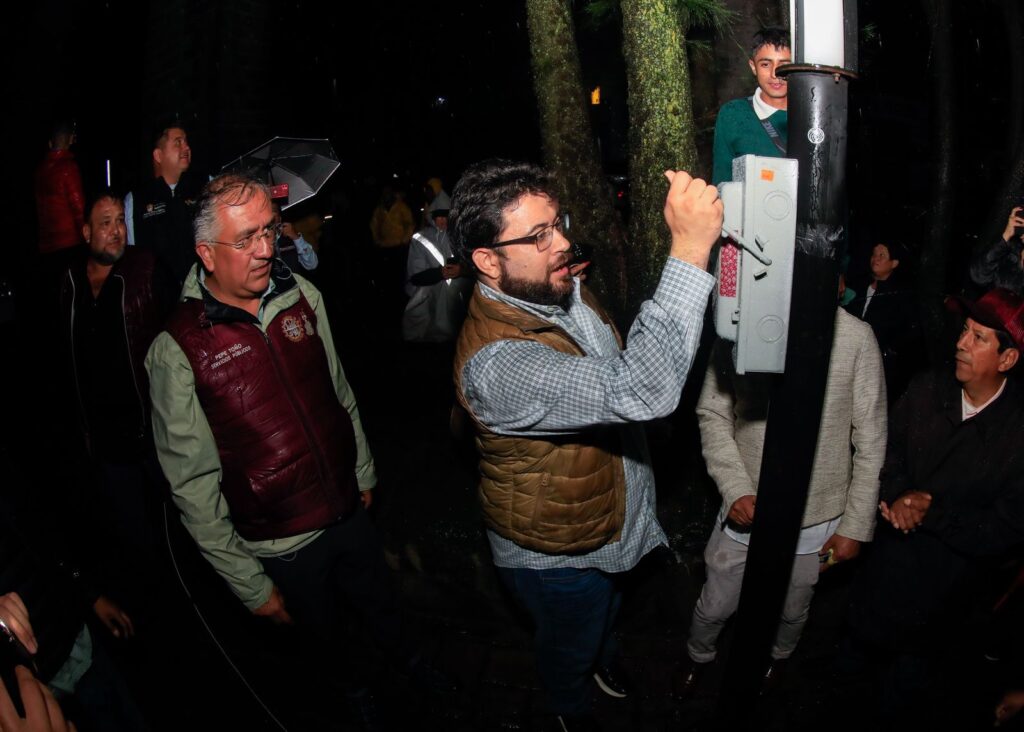 El alcalde, acompañado por vecinos y vecinas, bajo una intensa lluvia realizó el encendido de los Arcos de los Remedios, donde se instalaron 130 luminarias arquitectónicas, la rehabilitación de otras 70 y la colocación de un poste, así como 5,000 metros de cableado.