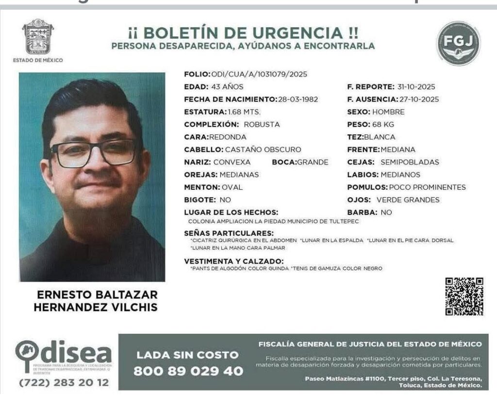La principal línea de investigación apunta a que podría tratarse del sacerdote de 43 años, visto por última vez en la colonia Ampliación La Piedad, en Tultepec.