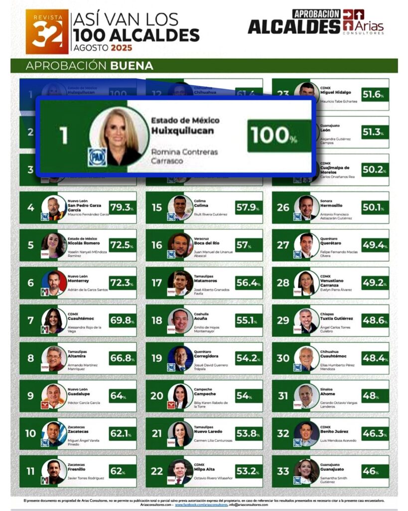 Y es que, de acuerdo con la más reciente encuesta de Arias Consultores “Así van los alcaldes”, correspondiente al mes de agosto, la presidenta municipal de Huixquilucan, Romina Contreras Carrasco, ocupa la posición número uno a nivel nacional en rubros como desempeño, confianza y seguridad, donde obtuvo 100 por ciento de aprobación ciudadana, en una medición que incluyó a más de cien alcaldes de todo el país.