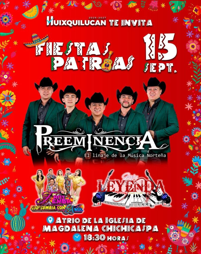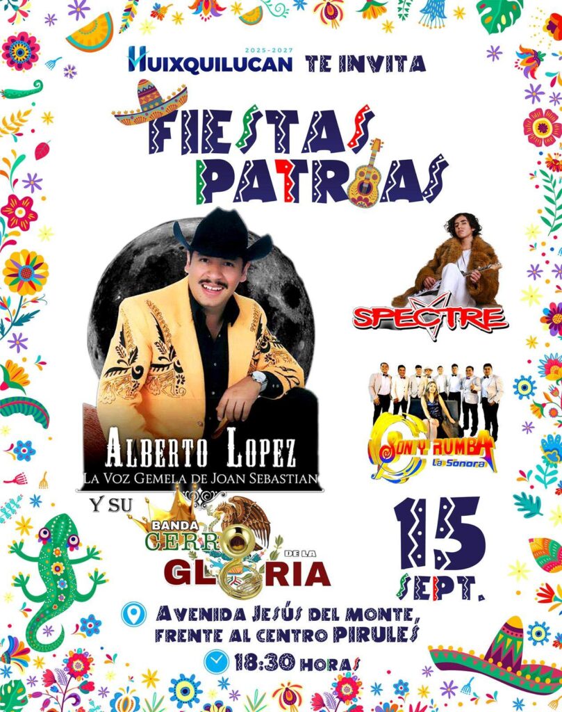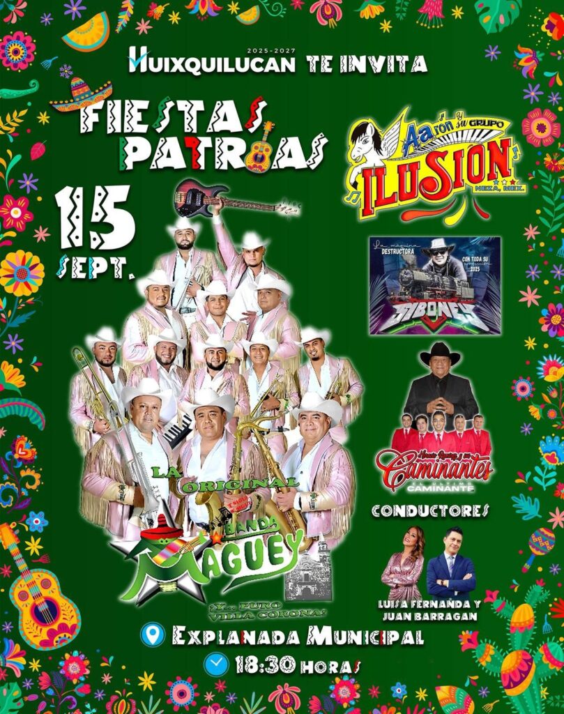HUIXQUILUCAN, Méx.- Con motivo del 215 Aniversario del Inicio de Independencia de México, el Gobierno de Huixquilucan invita al festejo de las “Fiestas Patrias 2025”, que se llevará a cabo este lunes 15 de septiembre en cuatro sedes, con diversas sorpresas, entre las que destaca la presencia de La Original Banda Maguey, Aarón y su Grupo Ilusión y Horacio Ramírez y sus Caminantes, entre muchas otras.