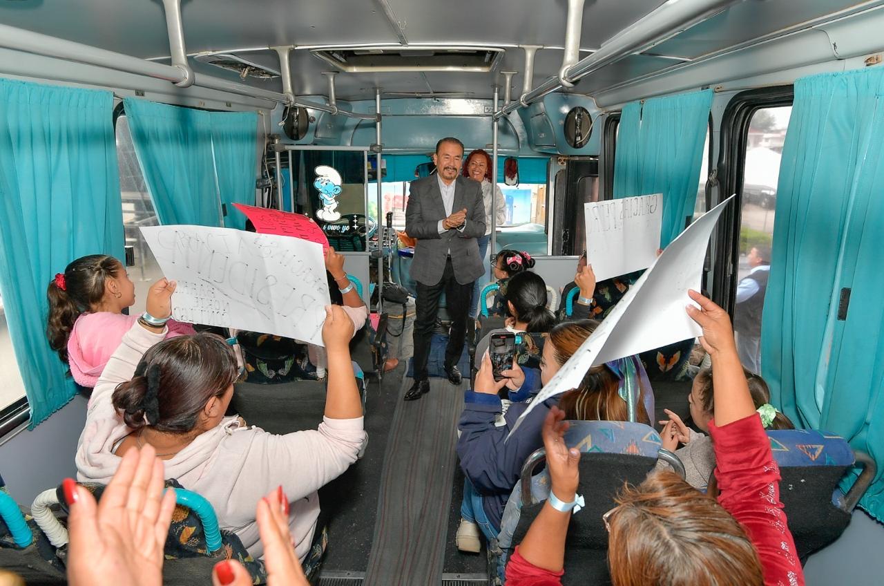 Antes de salir el convoy de 5 camiones de pasajeros, el Presidente Municipal subió a saludar a las y los niños, desearles un feliz viaje y recomendarles en todo momento estar junto al grupo y a las coordinadoras y coordinadores a cargo. Cada niño o niña asistió a este viaje acompañado de algún miembro de su familia.