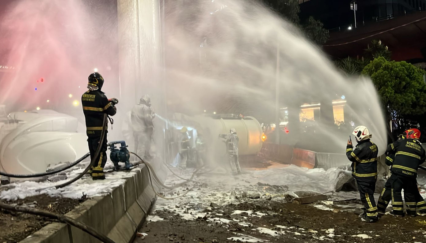CIUDAD DE MÉXICO, Méx.- Este lunes 26 de mayo una pipa volcó sobre Periférico, a la altura de Palmas, por lo que derramó combustible y ocasionó corte a la circulación en la zona.