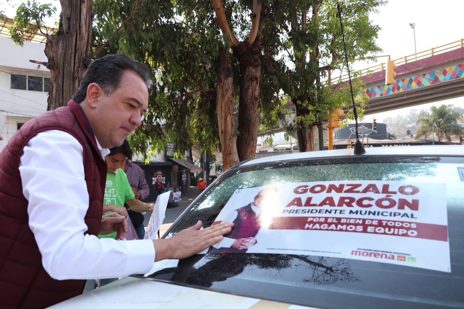 Este jueves, el candidato a la presidencia municipal por la coalición Sigamos Haciendo Historia acudió a los sitios de taxis afiliados a esta organización para entregar sus propuestas de campaña y pegar calcomanías y microperforados en las unidades.