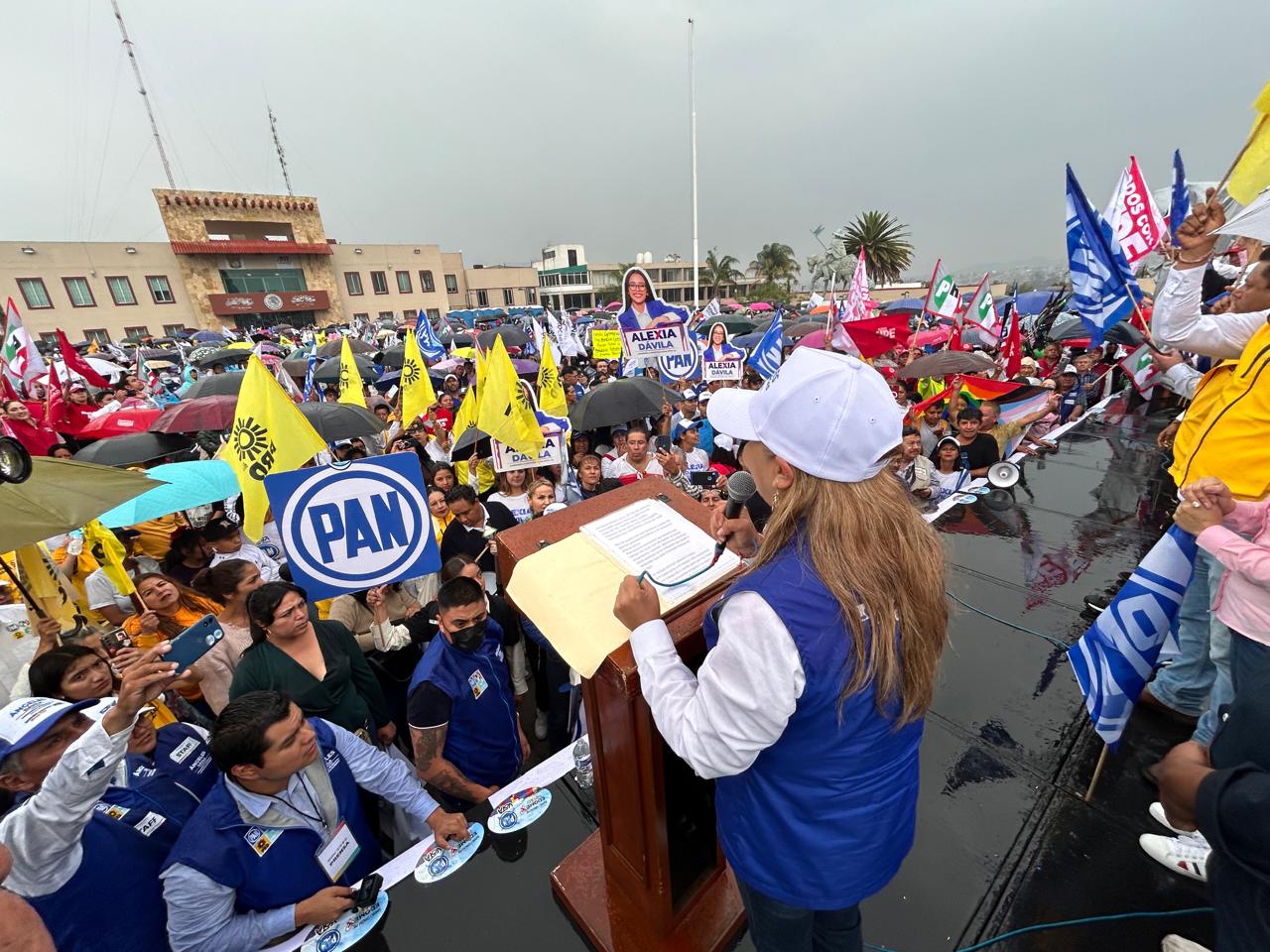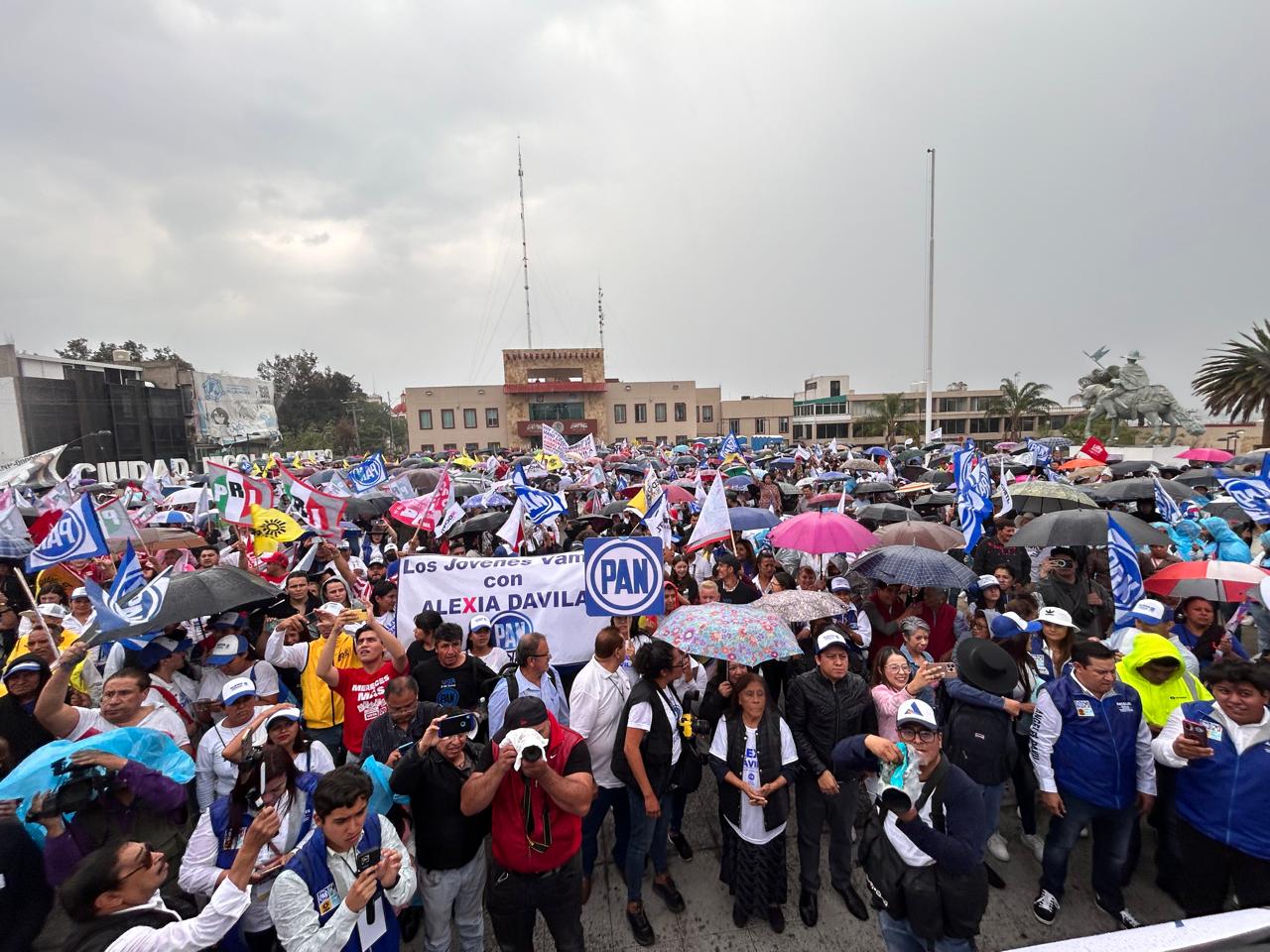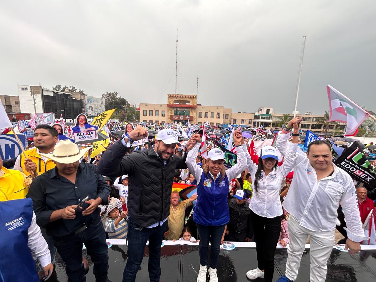NICOLÁS ROMERO, Méx.– Con gritos y porras fue recibida Ángeles Dávila Vargas, candidata a la presidencia municipal de Nicolás Romero, por el PAN, PRI, PRD y Nueva Alianza, por miles de personas que acudieron a su cierre de campaña en la explana del Palacio Municipal.