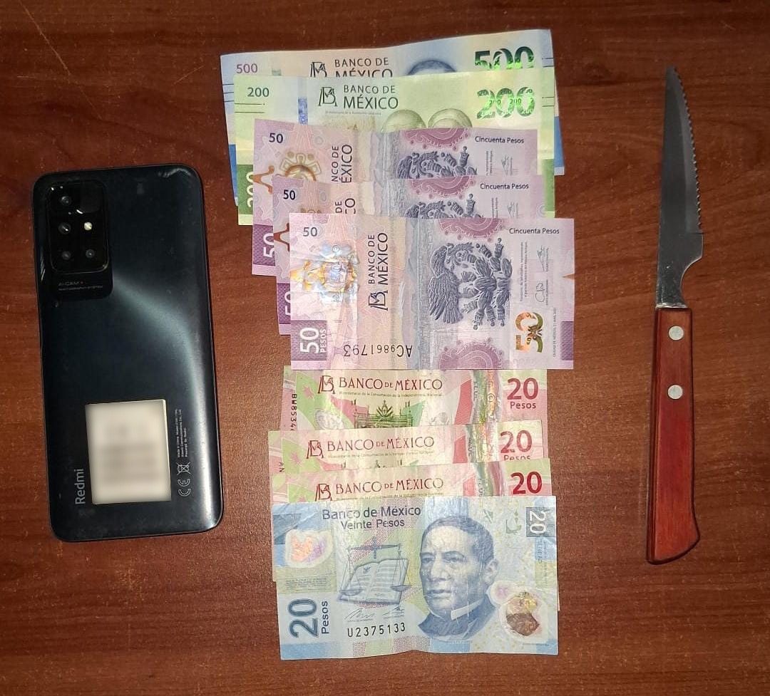 Finalmente, los alcanzaron en las Inmediaciones del andén I del paradero del metro Cuatro Caminos, en la colonia Parque Industrial. Bajo los protocolos de actuación, se realizó una revisión y al concluir les encontraron un cuchillo metálico con mango de madera, un teléfono móvil color negro y dinero en efectivo.