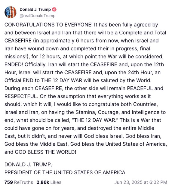 ESTADOS UNIDOS, Méx.- El presidente de Estados Unidos, Donald Trump, informó en su cuenta de Truth Social que “Israel e Irán han acordado por completo que habrá un alto al fuego completo y total (en aproximadamente 6 horas, cuando Israel e Irán hayan concluido y completado sus misiones finales en curso), durante 12 horas, momento en el que se considerará que la guerra ha terminado”.